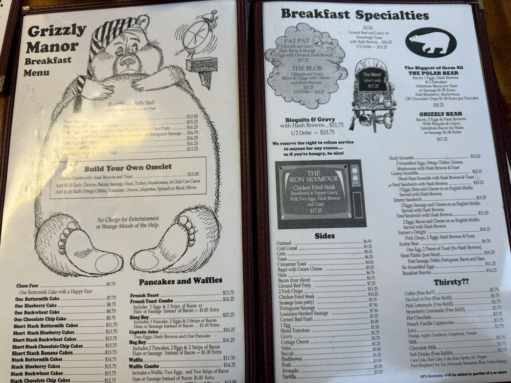 Welcome to Grizzly Manor Cafe, your premier destination for American breakfast and brunch in Big Bear Lake. This cozy eatery delights diners with generous portions, ensuring you leave with a satisfied smile. A popular choice among locals and tourists alike, Grizzly Manor is known for its massive pancakes—many patrons claim they’re larger than your head! This inviting establishment features a rustic decor adorned with stickers and veteran memorabilia, enhancing its homey vibe.
